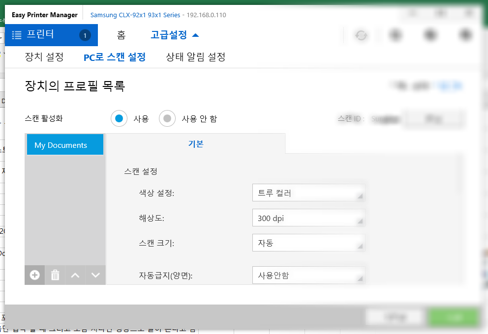 스캔파일 저장할 네트워크 공유 폴더 설정 폴더 설정에 네트워크 경로를 넣어주거나 pc의 고정 ip주소를 넣고 폴더 넣어주면 된다. ex) 192.168.0.xxx\폴더명 이후 테스트 해보면 정상적으로 작동한다